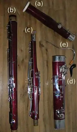 Hlavice je nasazená na basové rouře, která je spolu s křídlem upevněná na botě; jednotlivé části viz obrázek vpravo dole. Na částech (a) – (d) se nachází klapky, které stejně jako u ostatních dechových nástrojů mění délku vzduchového sloupce a tím i výšku tónu. Fagoty se vyrábějí nejčastěji z javorového dřeva, francouzský typ z palisandru, vývrt je kónický, stejně jako u hoboje nebo saxofonu. Na botě je připevněná podpěra pravé ruky, která umožňuje hraní všemi pěti prsty. Do křídla je zasazeno eso, které se vyrábí z různých druhů kovů: niklová mosaz, mosaz, stříbro apod. Fagotisté mají několik různě dlouhých es (takto je možné fagot hrubě naladit), mírným povytahováním esa se fagot dolaďuje.