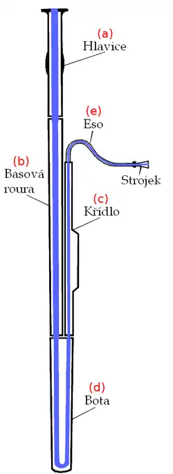 Nástroj je dlouhý 1,35 m, celková délka vzduchového sloupce je ale 2,59 m – vychází ze strojku a pokračuje přes eso, křídlo, botu, basovou rouru do hlavice.