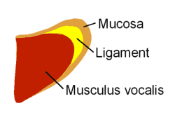 | „ | Při uvolnění hlasivkových svalů může krikotyroidní sval podélně působit velkým napětím na hlasivkové vazy. Toto napětí se může zvyšovat za účelem zvýšení tónu i poté, co bylo dosaženo maximální délky hlasivek. To ztenčí hlasivky natolik, že rozdíl vertikální fáze začne být zanedbatelný. Hlasivkové svaly se posunou na stranu hrtanu a vibrace se odehrávají téměř výhradně ve vazech.[6] | “ |