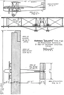 V létě roku 1918 započala francouzská společnost Avions Henri et Maurice Farman se stavbou bombardovacího letounu FF.60, který byl však dokončen jako pohodlný dopravní velkoletoun. Celodřevěný dvouplošník s pevným záďovým podvozkem poháněly dva hvězdicové, vzduchem chlazené devítiválcové motory Salmson Z-9 o výkonu po 169 kW. Prototyp pojmenovaný Goliath byl dohotoven ještě před koncem roku 1918 a již 8. února 1919 s ním poručík Lucien Bossoutrot přeletěl s jedenácti důstojníky na palubě z Toussus-le-Noble u Paříže do Kenley u Londýna. 1. dubna 1919 Bossoutrot vzlétl se čtyřmi cestujícími do výšky 6 300 m, 3. dubna se 14 cestujícími do 6 200 m a 5. května dokonce s 25 osobami vystoupal do hladiny 5 100 m. Tyto na tehdejší dobu pozoruhodné výkony registrovala FAI ihned jako rekordy. V srpnu téhož roku s letounem provedl dálkový přelet bez mezipřistání z Paříže do Casablanky. Trať dlouhou 2 050 km urazil za 18 h 23 min.