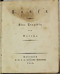 V roce 1808 vychází Faust. Prvý díl tragédie od Goetha. Goethe se snažil látku zbavit pesimismu. Dal svému zpracování náznak šťastného konce, aniž by jej podřídil náboženským dogmatům. Druhý díl Fausta, vydaný v roce 1832, už je považován spíše za kulturní a kritický esej než za divadelní hru. Goetha tato látka zaměstnávala téměř šedesát let; představil Fausta jako renesančního člověka a humanistu, jako moderního intelektuála, osvobozeného od poručnictví církve. Jeho podání klade důraz na Faustovu touhu po znalostech a mnohosti zkušeností. Tragédie učence dospěje k svému vrcholu, když si Faust musí přiznat, že jeho vlastní síly k touženému poznání světa nestačí. Goethe tedy odůvodňuje smlouvu s ďáblem smýšlením, které není zásadně zavrženíhodné. (Nakonec i Lessing považuje zvídavost za nejvznešenější pud člověka.) Kromě toho Goethův Faust spojuje touhu po vědění s tragédií Markétky. Markétka, Faustem svedená, je oproti němu ztělesněním čisté nevinnosti.