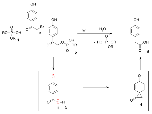 Fotochemická obdoba Favorského přesmyku může být použita na odstranění p-hydroxyfenacylových chránicích skupin z organofosfátů jako je adenosintrifosfát;[10] reakce probíhá přes tripletový diradikál (3) a diketonový spiro meziprodukt (4).[11]