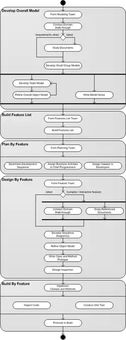 Na rozdíl od procesního frameworku XP zachovává tato metodika fázi modelování systému. Za základní model je zde považován doménový model na vysoké úrovni abstrakce, který popisuje celý systém a slouží tak k minimalizaci problémů integrace a kolaborace jednotlivých částí vytvořených různými programátory. Práce na projektu je poté rozdělena do zpravidla dvoutýdenních iterací, přičemž v každé iteraci jsou navrhovány a implementovány konkrétní užitné vlastnosti systému (features).[2] Dalším rozdílem od procesního frameworku XP případně SCRUM je fakt, že jednotliví programátoři si sami nevybírají práci, kterou budou řešit. Každému z nich je přidělena zodpovědnost za část doménového modelu – za jeden objekt. V případě, že řešená vlastnost vyžaduje spolupráci více objektů s rozdílnými vlastníky, je vytvořen tým pro řešení dané vlastnosti – feature team.[3][4]