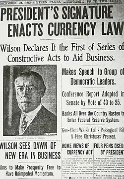 Dobová přední stránka novin informující o Wilsonově Zákonu o federálních rezervách (Federal Reserve Act)