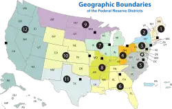Federální rezervní systém má 12 regionů, tzv. distriktů. Každý distrikt má svého guvernéra, jenž je současně šéfem oblastní správní rady a členem rady guvernérů, a oblastní banku, která může mít pobočky v dalších městech.