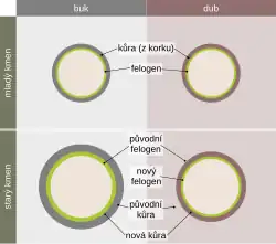 Felogén (korkové kambium) je druhotný meristém, který se zakládá pod pokožkou rostlin a způsobuje její tloustnutí. Směrem dovnitř stonku vytváří parenchymatické buňky zelené kůry. Ty obsahují četné chloroplasty a na vnější stranu stonku odděluje buňky korku. Korek může vznikat i na místě poranění rostliny (prasklá hlíza kedlubnu).[1] Takové korkové vrstvy se mohou trhat, proto felogén zastaví svou činnost a v hlubších vrstvách se zakládá felogén nový. Odumřelá vnější pletiva se odlučují jako borka. Protože korkovými pletivy by byl vnitřek rostliny úplně oddělen od vnějšího prostředí a znemožněna výměna plynů, jsou v korkovém pletivu čočinky (lenticely), vyplněné odumřelými buňkami s velkými mezibuněčnými prostorami, umožňujícími výměnu plynů. Lenticely jsou patrné např. na větvičkách černého bezu, břízy aj.
