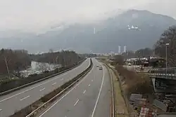 Kvůli rozšíření dálnice A13 na čtyři jízdní pruhy musel být Rýn u kostelního kopce v Domatu odkloněn na stranu Felsbergu. Za tímto účelem byl vytěžený materiál převezen přes staveništní most na stranu Domatu. Tento most smetla povodeň 18. července 1987. Koryto řeky bylo po povodni hlubší asi o 1,5 metru.