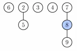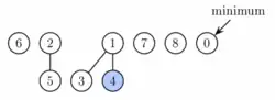 Ve třetím kroku procházíme všechny zbývající kořenové prvky a z nich hledáme nové minimum. Potence haldy se při tomto kroku nemění.