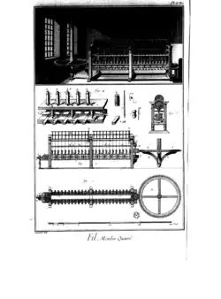 Mechanismus s převody ozubeného kola poháněného mlýnským kolem se dochoval v kresbě Leonarda da Vinci. Přesné popisy v knize Victoria Zonzy z italské Padovy pocházejí z roku 1607.[2]. Nejlepší výrobní popisy filatorií s rytinami přinesla první Francouzská encyklopedie z let 1771-1776, která věnovala celý jeden svazek hedvábnictví (Soierie).