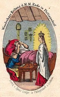 V noci z 12. na 13. ledna 1866 dle příběhu uzřela nemocná u svého lůžka velkou ženskou postavu v zářícím bílém plášti s korunkou na hlavě. Silně nábožensky založená Madgalena, která byla velkou ctitelkou Panny Marie, byla zjevením údajně oslovena: něm. „Mein Kind, von jetzt an heilt’s“ („Mé dítě, od nynějška budeš zdráva“, nebo „Mé dítě, od teď se to bude hojit“[6]). Ráno po tomto zjevení Magdalena Kadeová měla vstát zcela zdráva, a mohla dokonce opět začít pracovat.[7]
