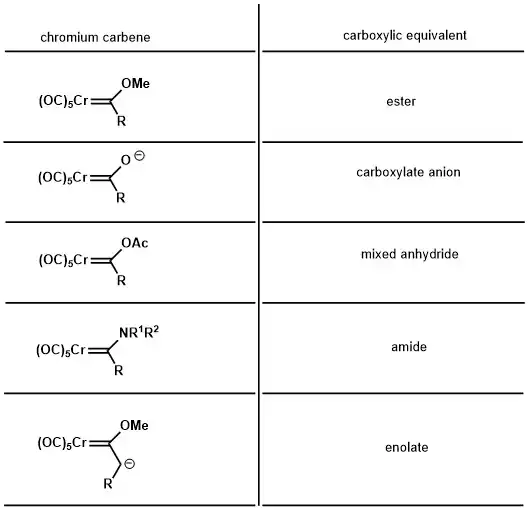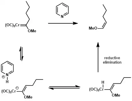 Pokud se na vedlejším řetězci Fischerova karbenu nachází α-proton, tak může být vratně odštěpen slabou zásadou, například pyridinem. Při těchto reakcích se vytvářejí chromhydridové meziprodukty, u kterých poté probíhají redukční eliminace za vzniku cis-enoletherů.[14]