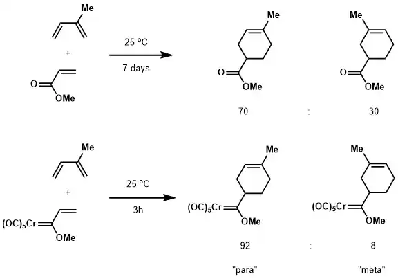 Odtahování elektronů ve Fischerových karbenech se projevuje i na dalších reakcích, jako je Dielsova-Alderova reakce methylakrylátu s isoprenem, která po 7 dnech za pokojové teploty vykazuje jen mírnou para-meta selektivitu, zatímco u odpovídajícího Fischerova karbenu se za pouhé 3 hodiny dosahuje výrazně vyšší para-meta selektivity.[8]