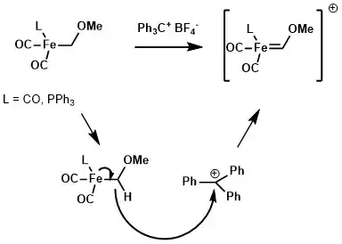 Za přítomnosti vhodné sloučeniny, například tritylového kationtu, lze odštěpit hydridové ionty z alkylových ligandů kovových komplexů a vytvořit tak Fischerovy karbeny.[2]