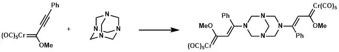 Urotropin, který je slabým nukleofilem, se může účastnit Michaelových adicí na alkynylové Fischerovy karbeny, přičemž se utváří produkty dvojnásobných adicí.[9]