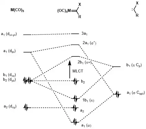 Karbenový komplex kovu je Fischerovým karbenem, pokud je karben v singletovém stavu. Delokalizace volného elektronového páru substituentu na karbenovém uhlíku navyšuje energii orbitalu pz, v důsledku čehož zůstávají dva elektrony karbenu v podobě elektronového páru. Vazby mezi karbenem a kovem vytváří silné dodávání σ elektronů z orbitalu sp2 do prázdného orbitalu d u kovu a slabou π-retrodonaci z kovu do prázdného orbitalu pz. Z důvodu nízké míry π-donace je karbenový uhlík elektrofilní.[1]