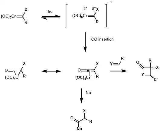 Ultrafialovo-viditelná spektra Fischerových karbenů obsahují absorpční pásy vazeb kov-ligand v blízké ultrafialové oblasti. Příslušná excitace způsobí přesun elektronu z orbitalu kovu do orbitalu ligandu, což zvýší elektronovou hustotu na karbenovém uhlíku. Kovové centrum, mající již pod vlivem karbonylových ligandů nízkou elektronovou hustotu, se stane ještě chudším na elektrony, což vyvolá migrační inserci na CO ligand a vytvoří se Cr-metalocyklopropanon, jenž je rezonanční formou metalovaného ketenu. S využitím reaktivity ketenů lze tuto sloučeninu zachytit pomocí některých nukleofilů, jako jsou alkoholy a aminy, nebo nechat reagovat v [2+2] cykloadicích s alkeny za vzniku cyklobutanů, iminy za vzniku β-laktamů, či s aldehydy na β-laktony.[15]