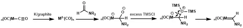 Fischerovy karbeny obsahující α-vodíky se připravují reakcemi karbonylových aniontů s formamidem. Konečný produkt se vytváří reakcí mmeziproduktu s nadbytkem trimethylsilylchloridu.[4]