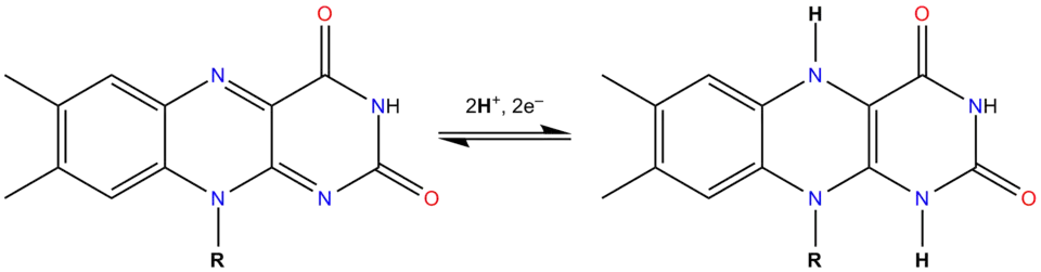 Stejně jako u nikotinamidových koenzymů lze hydrogenační reakce i v případě flavinových koenzymů odvozovat od hypotetického hydridového iontu, který se chová jako nukleofilní činidlo a je schopen se nejen navázat na oxidovaný koenzym a tím ho redukovat, ale také se případně od redukovaného koenzymu odštěpit.