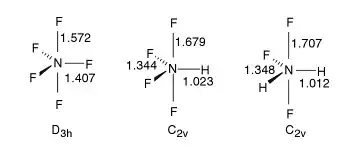 4 F−). Podle teoretických modelů by jeho molekula měla mít strukturu kovalentní trigonální bipyramidy s grupou symetrie D3h nebo NF +