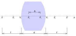 Ze znalosti ohniskových vzdáleností obou lámavých ploch, které tvoří čočku, tzn. , lze odvodit ohniskové vzdálenosti čočky a .