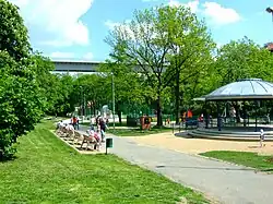 Park přetíná ve zhruba čtyřicetimetrové výšce Nuselský most, postavený roku 1973, dopravní tepna hlavního města.