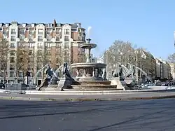 Fontána se skládá z velkého kruhového bazénu, ke kterému přiléhají tři nádrže. Je vyzdobená osmi bronzovými lvy, kteří chrlí vodu. Autorem lvů je sochař Henri-Alfred Jacquemart. Na kamenných podstavcích, které podpírají dolní nádrž, spočívají ženské hlavy, které vytvořil Louis Villeminot.