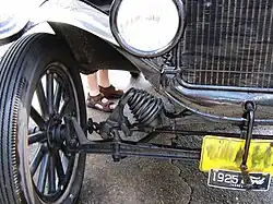Zavěšení kol na Fordu model T. Vinutá pružina je volitelná dokupovaná výbava, nabízená jako „Hasslerův tlumič kmitů.“