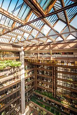 Budova Fordovy nadace pro sociální spravedlnost v New Yorku (původně Ford Foundation Building), dokončená v roce 1968 firmou Roche-Dinkeloo, byla první velkou architektonickou stavbou v zemi, která věnovala podstatnou část svého prostoru zahradnickým aktivitám. Atrium budovy bylo navrženo tak, aby městská zeleň byla přístupná všem, a je příkladem aplikace environmentální psychologie v architektuře. Budova na Manhattanu byla v roce 1968 oceněna časopisem Architectural Record jako „nový druh městského prostoru“. Tuto koncepci návrhu použili i další architekti u mnoha krytých nákupních center a mrakodrapů postavených v následujících desetiletích. Newyorská komise pro ochranu památek označila budovu v roce 1997 za architektonickou památku.[8]