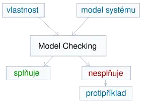 - Model checking (ověřování modelů): rozhoduje, zda systém splňuje danou vlastnost nebo ne. Pokud systém danou vlastnost nesplňuje, dokáže model checking ukázat protipříklad, tedy chování systému, které porušuje danou vlastnost.