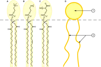 Příklady fosfolipidů: A - fosfatidylcholin, B - fosfatidylethanolamin, C - fosfatidylserin, D - hydrofilní hlava (1) a hydrofobní ocas (2)