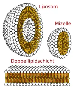 Různé struktury fosfolipidů ve vodných roztocích: lipozom, micela a dvojitá lipidová vrstva (hlavní složka biomembrány)