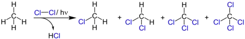 Fotochlorace uhlovodíků jsou neselektivní, přestože reaktivita vazeb C-H klesá v řadě terciární > sekundární > primární; při 30 °C v poměru přibližně 4,43 : 3,25 : 1. Vazby C-C se reakcí neúčastní.[9][10]