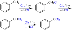 Fotochlorace toluenu je selektivní vůči methylové skupině; lze tak získat mono- až trichlorované produkty, nejvýznamnějším z nich je monosubstituovaný benzylchlorid, jenž bývá následně hydrolyzován na benzylalkohol. Benzylchlorid lze také přeměnit na benzylkyanid a ten hydrolyzovat na kyselinu fenyloctovou.[22][23] Disubstituovaný benzalchlorid se převádí na benzaldehyd, používaný jako ochucovadlo[24] a jako meziprodukt výroby barviv, jako je například malachitová zeleň.[25] U trisubstituovaného benzotrichloridu se provádí hydrolýza za účelem výroby benzoylchloridu:[26]