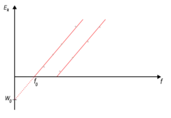 kde je energie dopadajícího fotonu, je minimální energie potřebná k uvolnění elektronu (tedy výstupní práce) a je maximální možná energie uvolněného elektronu.