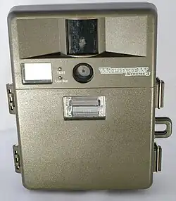 Fotografická past pro fotografování zvěře v přírodě; nahoře je detektor pohybu, uprostřed objektiv, dole blesk a vlevo LCD s počtem pořízených snímků
