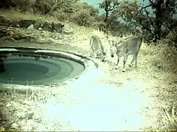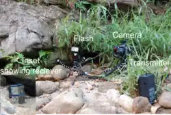 Nastražená past se schovaným přijímačem infračerveného signálu. Vše je umístěno tak, aby potenciální zvíře přerušilo paprsek a bylo zachyceno fotoaparátem