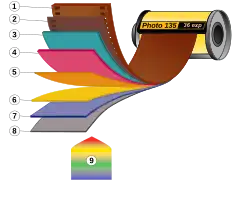 Vrstvy barevného filmu: 1. filmová báze (základní vrstva), 2. mezivrstva, 3. vrstva citlivá na červené světlo, 4. vrstva citlivá na zelené světlo, 5. žlutý filtr, 6. vrstva citlivá na modré světlo, 7. UV-filtr, 8. ochranná vrstva, 9. viditelné světlo