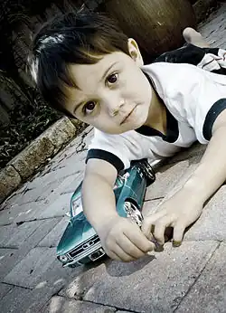 • Je vhodné také dítě zaujmout hračkou, která s ním komunikuje. Pokud chce fotograf dosáhnout přímého pohledu do fotoaparátu, může si nasadit šaškovský nos, mluvit jako pohádková postava nebo podobně.[55]