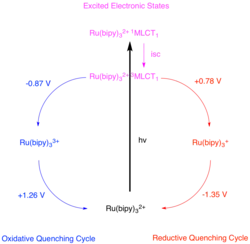 Dlouhotrvající tripletový excitovaný stav získatelný fotoexcitací je jak lepším redukčním činidlem, tak i lepším oxidačním činidlem než základní stav katalyzátoru. Jelikož je senzitizátor koordinačně nasycený, tak musí přesun elektronu proběhnout ve vnější sféře, kde se elektron protuneluje od katalyzátoru k substrátu.
