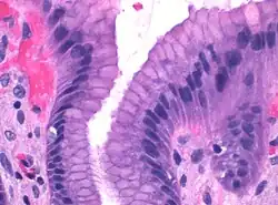 Epiteliální buňky mají cylindrický tvar. Jsou vysoké 20-40 µm. Jádro, kulové či oválné, je uložené u báze buněk, kde se také nachází granulární endoplazmatické retikulum a nad ním Golgiho aparát. V apikální části buněk se vyskytují četná světlá hlenová granula.[5]