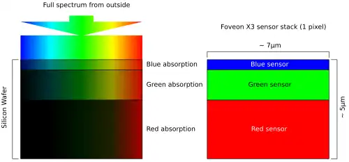 Na levé části obrázku je vidět, do jaké hloubky křemíku jsou různé barvy schopny pronikat - barvy s delší vlnovou délkou (červená) proniknou hlouběji než barvy s kratší vlnovou délkou (modrá). Tomu je přizpůsobeno pořadí a síla jednotlivých vrstev snímače (pravá část obrázku).