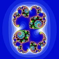 Dokonce 2000 násobné zvětšení Mandelbrotova fraktálu nesníží kvalitu nejjemnějších detailů jež stále mají charakteristický tvar celého obrazce.