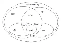Rozdělení framů. ENF: Equal norm frames, TF: Tight frames, ENTF: Equal-norm tight frames, UNF: Unit-norm frames, PTF: Parseval tight frames, UNTF: Unit-norm tight frames, ENPTF: Equal norm tight frames, ONB: Ortonormální báze