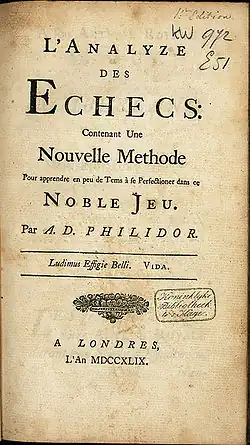 Titulní strana Philidorovy knihy L‘Analyse du Jeu des Echecs z roku 1749.