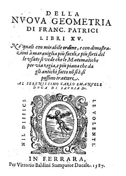 - Della nvova geometria di Franc. Patrici libri XV. Ne' quali con mirabile ordine, e con dimostrazioni à marauiglia più facili, e più forti delle usate si vede che la matematiche per uia regia, e più piana che da gli antichi fatto n? si è, si possono trattare … Ferrara, Vittorio Baldini 1587 [bound in the same vol. Quattro Libri Geometrici di Silvio Belli Vencntino!. Venice. 1595.]