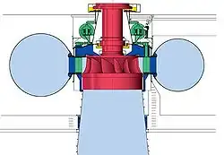 Jak voda prochází oběžným kolem, její rotační rychlost se zmenšuje a zároveň odevzdává energii oběžnému kolu. Tento efekt (spolu s působením samotného vysokého tlaku vody) přispívá k efektivitě turbíny.