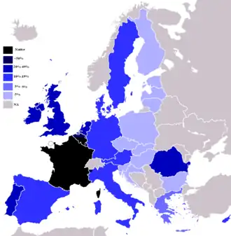 RozšířeníFrancie, Alžírsko, Belgie, Benin, Burkina Faso, Burundi, Čad, Demokratická republika Kongo, Džibutsko, Francouzská Guyana, Francouzská Polynésie, Gabon, Gambie, Guadeloupe, Guinea, Haiti, Itálie, Kambodža, Kamerun, Kanada, Komory, Kongo, Laos, Libanon, Lucembursko, Madagaskar, Mali, Martinik, Mauricius, Mayotte, Monako, Niger, Nová Kaledonie, Pobřeží slonoviny, Réunion, Rovníková Guinea, Rwanda, Saint Pierre a Miquelon, Senegal, Seychely, Středoafrická republika, Švýcarsko, Togo, Tunisko, Vanuatu, Vietnam, Wallis a Futuna
