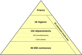 Území Francouzské republiky se v současné době dělí na 101 departementů, z nichž 5 jsou departementy zámořské (Département d'outre-mer, DOM). Průměrný departement má rozlohu téměř 6 000 km2 a něco přes půl milionu obyvatel. Rozlohou se tedy blíží českému kraji, má však o něco méně obyvatel. Je v průměru téměř třikrát větší než tradiční britská hrabství (county), i v tomto srovnání má také obyvatel o něco méně. Departementy se dále dělí na administrativní arrondisementy (arrondissement), ty dále na kantony (canton) a nakonec na samosprávné obce (commune). Departement je jednotkou státní správy i občanské samosprávy.
