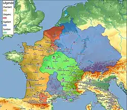 Po Chlodvíkově smrti v listopadu 511 si franskou říši rozdělili jeho čtyři synové: Chlothar (511–561), Childebert (511–558), Chlodomer (511–524) a Theuderich I. (511–534). Navázali na dobyvačnou politiku svého otce a upevnili franskou vládu v Akvitánii. Roku 531 se Chlothar a Childebert dokonce pokusili překročit Pyreneje a napadnout vizigótskou říši, nesetkali se však s úspěchem, a proto se jejich další výboje soustředily na východ. Roku 534 začlenili do své říše Burgundsko, roku 536 si podmanili Ostrogóty v Provence a poté začali s výboji i do Itálie, kde však byly jejich úspěchy jen dočasné kvůli problémům se zásobováním.[13]