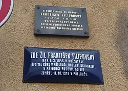 Zemřel 11. října 1919 v Přelouči.[14] Vděční občané umístili na jeho dům pamětní desku. Roku 1994 k ní přibyla další, připomínající syna – herce Františka Filipovského (1907–1993), který se v témže domě narodil.[4]